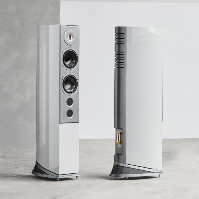 Tous les haut-parleurs de la série R utilisent un socle incliné. De cette façon, nous évitons les ondes stationnaires dans les enceintes et nous avons ainsi amélioré l'aspect élégant de nos enceintes. Nous les avons mis sur talons hauts, pour ainsi dire. Les socles sont équipés d'un ressort en acier intégré qui maintient les pointes afin de débarrasser les haut-parleurs de la masse du sol. Le résultat est un son plus articulé et plus correct