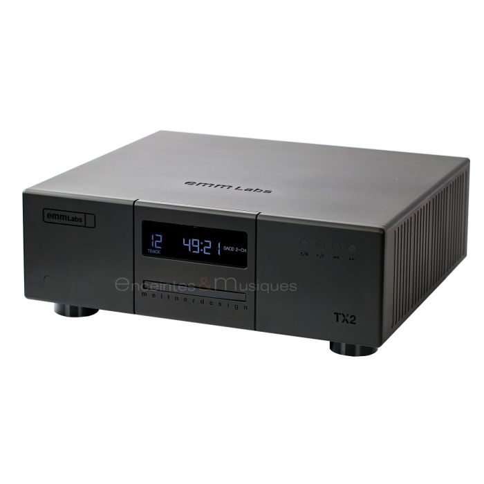 Le transport TX2 CD/SACD a été construit avec la technologie primée utilisée dans le TSDX et le XDS1 V2. Comme le DA2, le transport TX2 a également été doté de la dernière génération MDAT2™ DSP up-converting. Connecter de préférence le transport TX2 et DA2 via l'interface EMM Optilink à câble unique pour isoler galvaniquement le transport du DAC.
