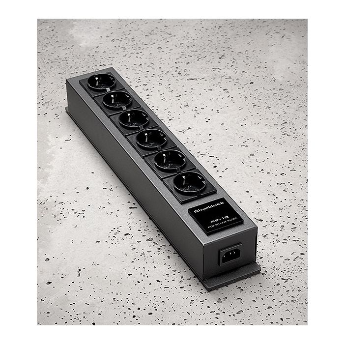 Le châssis massif de la barrette d'alimentation est entièrement en métal. Il constitue également un blindage parfaitement étanche protégeant des interférences RFI et EMI. Le câblage interne est composé de conducteurs en cuivre de 2,5 QMM de diamètre. Il y a six prises de sortie Schuko.