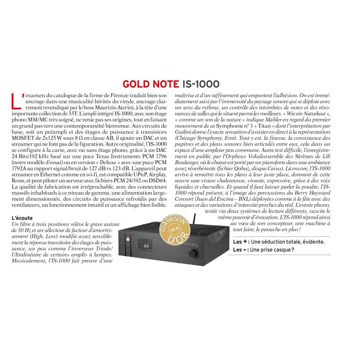 Les innovations techniques raffinées de l'IS-1000 proviennent directement des modèles phares de Gold Note, comme le préamplificateur P-1000 et l'amplificateur de puissance PA-1175, qui ont servis d'inspiration pour créer une nouvelle source qui intégrerait les composants analogiques d'un amplificateur de haute qualité avec les technologies numériques d'un Streamer et un DAC pour offrir des performances remarquables.