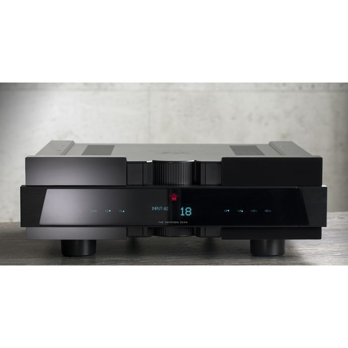 Le Gryphon Zena remplace la molette de volume à roulement à billes Athena par des boutons tactiles haut/bas pour créer un atténuateur de volume composé de 43 niveaux individuels par incréments de 2 dB, avec pas plus de deux résistances dans le trajet du signal de contrôle du volume à tout moment.