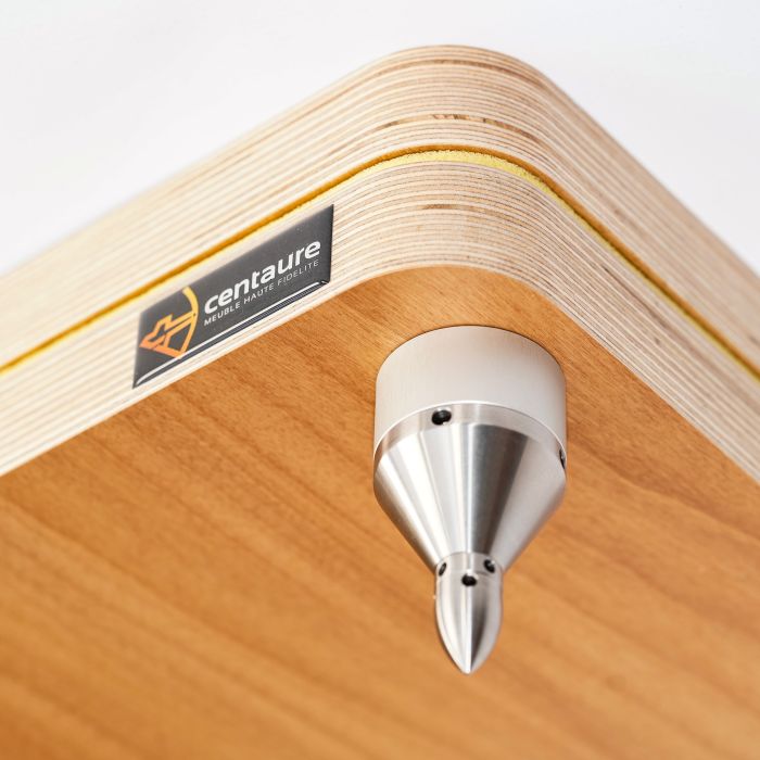 Théia est un double plateau decouplé par un elastomère spécialement conçu pour accueillir les électroniques à lampes ou à trransistors. Sa propre fréquence de résonance n'est quasiment pas mesurable. Il se pose indifféremment sur un meuble Centaure L ou sur n'importe quelle autre surface.