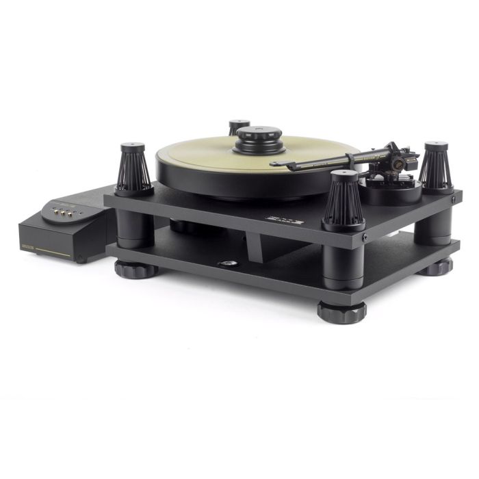 La platine est entraînée par un moteur outrunner triphasé sans balais, doté d'aimants en néodyme à 8 pôles et de 3 capteurs à effet Hall intégrés. Elle est pratiquement exempte de vibrations en raison de son poids de 2,5 kg et est isolée sur des supports en uréthane qui sont réglables pour un positionnement précis de la courroie.